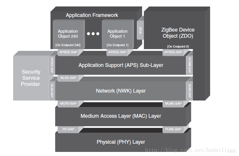 每一层使用的安全服务是多样化的,安全服务能够被ZDO、APS或NWK层使用,因此它在图的旁边。