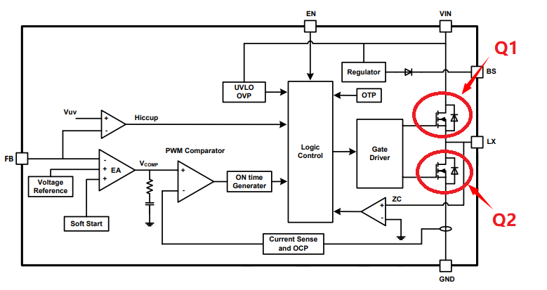 在DCDC开关电压调整器中,核心的关键是在内部集成的两个开关管Q1和Q2,这两个开关的品质决定了整个DCDC电压调整器的效率,市面上大部分DCDC电压调整器的效率可以达到90%以上,当你如果选用效率过低的时,多余的能量还是以热能的形式消耗了,主要是Q1和Q2的内阻消耗电流。