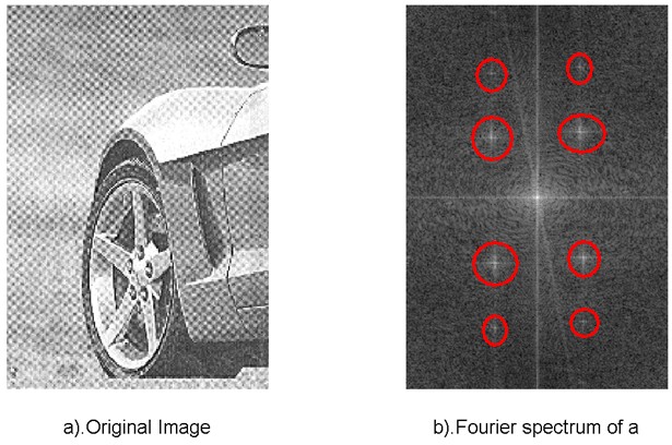 从空间域内看,图像存在着周期性噪声。其傅里叶频谱中,也能看到噪声的所在之处(这里我用红圈标注出来了,他们不是数据的一部分)。我们如果使用带阻滤波器的话,是非常麻烦的,也会使得图像有损失。陷波滤波器,能够直接对噪声处进行衰减,可以有很好的去噪效果。