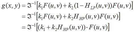 按照之前所说的,锐化滤波器是将傅里叶谱的直流分量保留,然后将其余的成分增幅。使用锐化滤波器,可以对图像的细节进行增强,使得细节凸显出来。锐化滤波器的表达式如下所示。