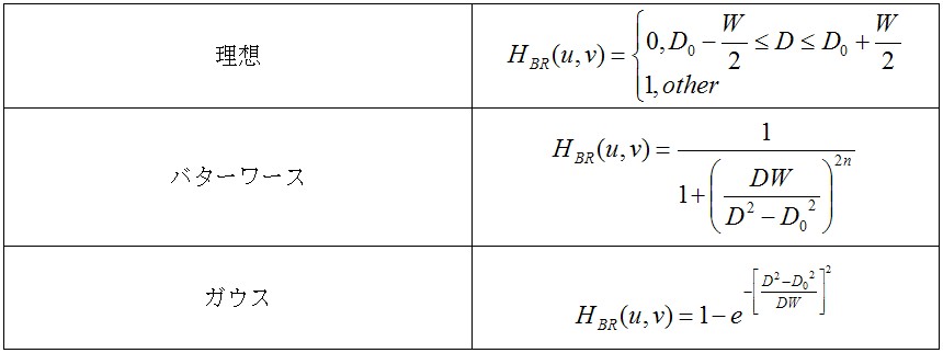 同样的,带阻滤波器也有三种特性。高斯、巴特沃斯和理想,三种类型,其数学表达式如下所示。