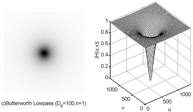 xlabel('c)Butterworth Lowpass (D_{0}=100,n=1)');