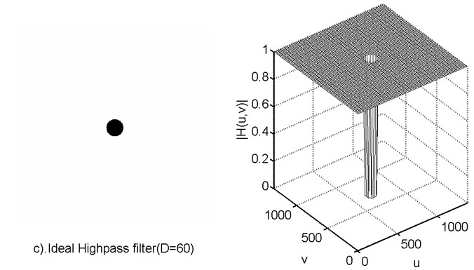 这里的D0是滤波器的阻带半径,而D(u,v)是点到滤波器中央的距离。理想高通的滤波器的振幅特性如下所示。