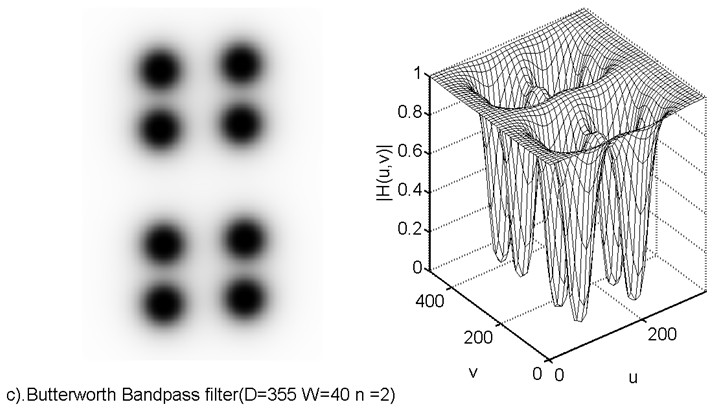 在原图的傅里叶谱上添加了几个很明显的亮点。在对其做IDFT,可以看到,原图被严重的周期噪声污染了。此时,我们可以使用带阻滤波器,可以有很好的去噪效果。为了避免振铃现象,选择使用如下所示巴特沃斯带阻滤波器,所用滤波器的次数为2次。使用空间域的操作,要去除这种噪声基本是不可能的,这也是频域内的操作的优点。