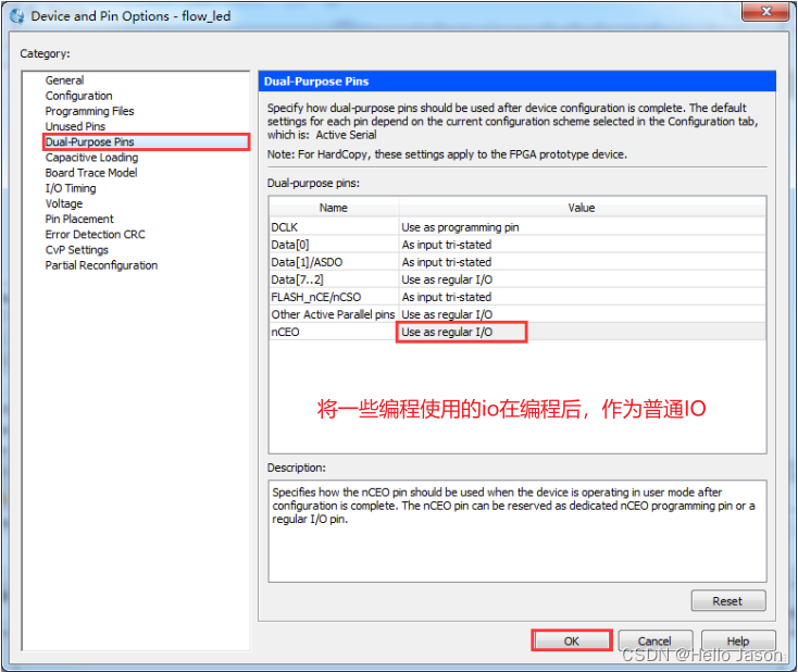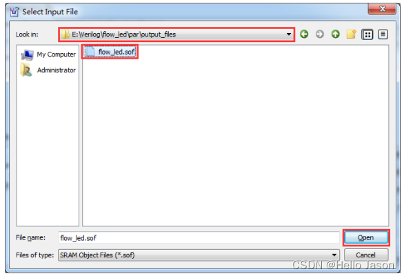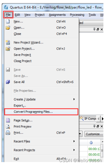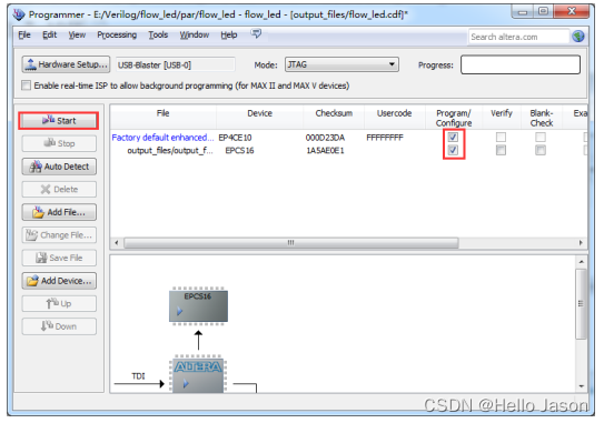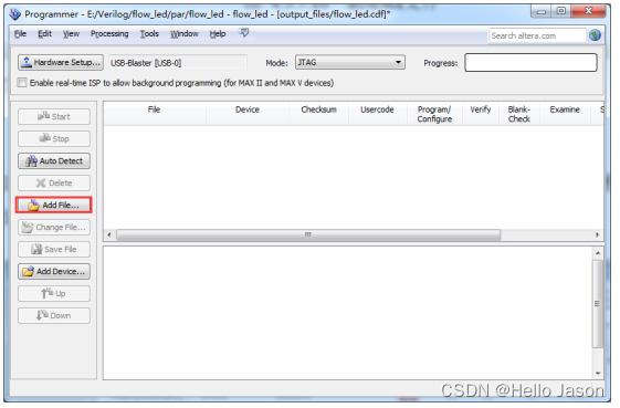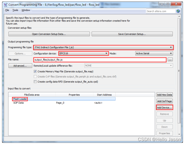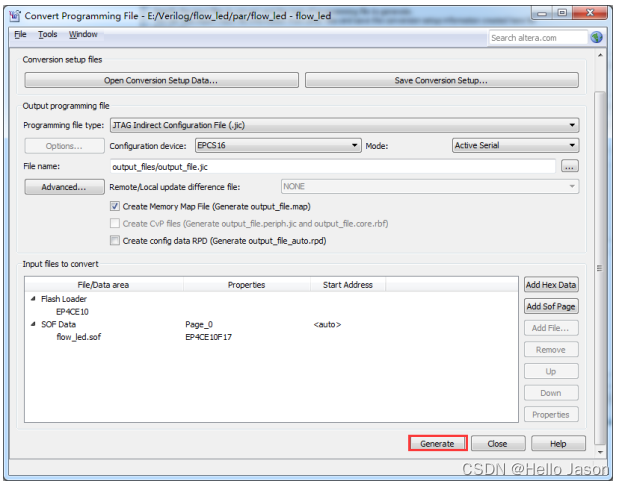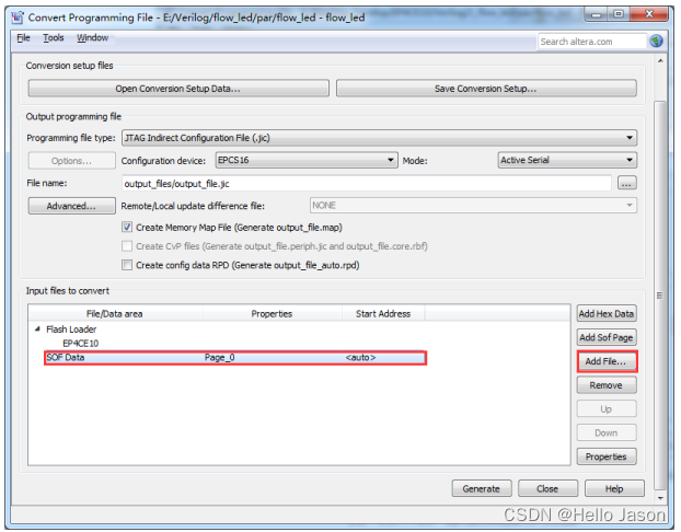 如果我们想要程序断电不丢失的话, 就必须将程序保存在开发板的片外Flash中, Flash的引脚是和FPGA固定的引脚相连接, FPGA会在上电后自动读取Flash中存储的程序,这个过程不需要我们编写驱动代码和人为干预,只需要通过JTAG下载jic文件即可。需要注意的是, jic文件不是软件自动生成的, 而是需要我们手动的将sof文件转换成jic文件。