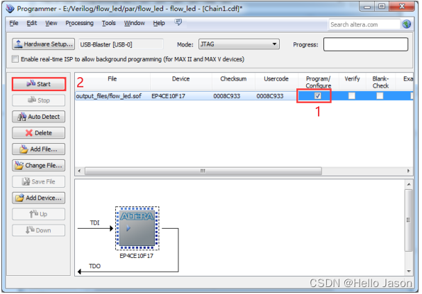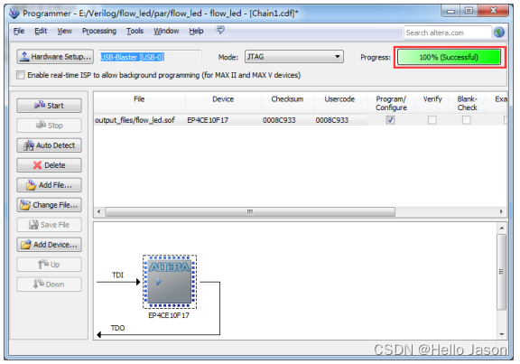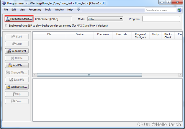 这里下载的程序是.sof文件格式,开发板断电后程序将会丢失。