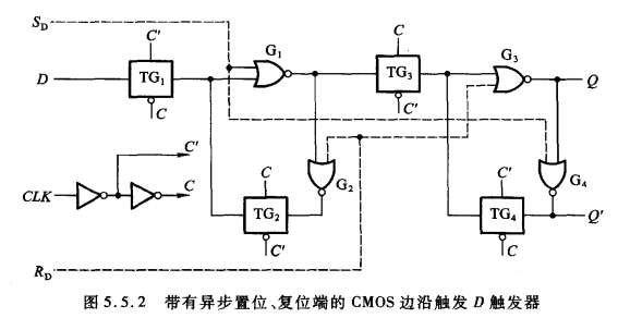 当CLK=0时,C'=1,C=0,此时TG1导通TG2截止,主触发器输出跟随输入状态,TG3截止TG4导通,从触发器输出处于自锁状态。