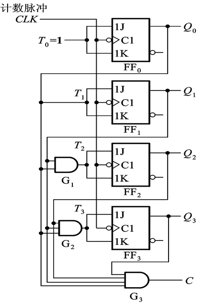 left { begin{array}{c} J_1 = K_1 = T_0 = 1\ J_2 = K_2 = T_1 = Q_0\ J_3=K_3=T_2=Q_1Q_0\ J_4=K_4=T_3=Q_2Q_1Q_0\ end{array} right.