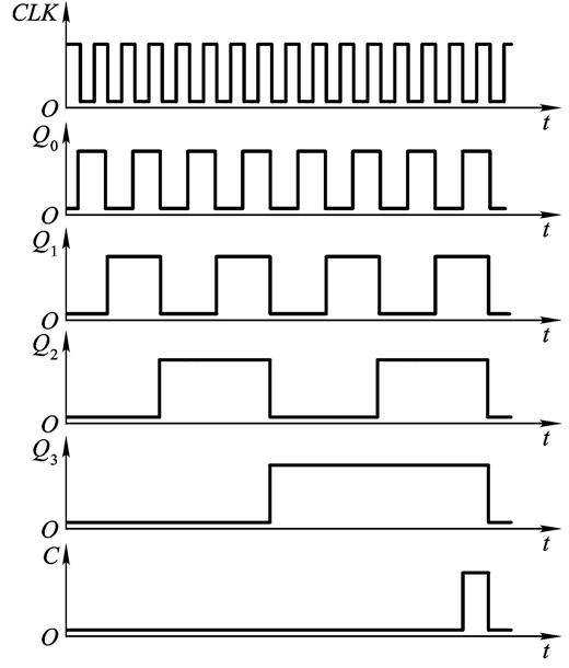 我们发现,输出信号的 Q 0 , Q 1 , Q 2 , Q 3 Q_0,Q_1, Q_2, Q_3 Q0,Q1,Q2,Q3的频率分别为 1 2 C L K , 1 4 C L K , 1 8 C L K , 1 16 C L K frac{1}{2}CLK, frac{1}{4}CLK,frac{1}{8}CLK, frac{1}{16}CLK 21CLK,41CLK,81CLK,161CLK说明这种计数器还具有分频功能