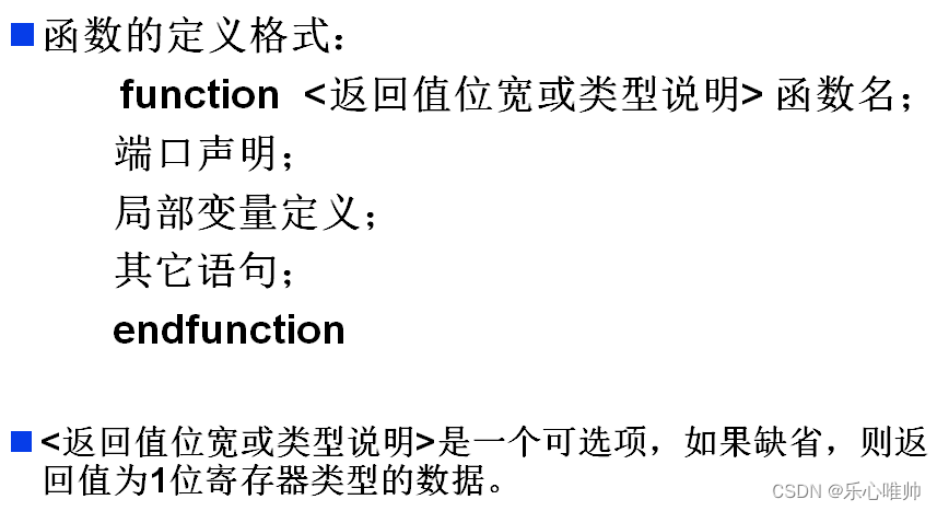 - 定义函数时,没有端口名列表,但调用函数时,需列出端口名列表,端口名的排序和类型必须与定义时的相一致。这一点与任务相同