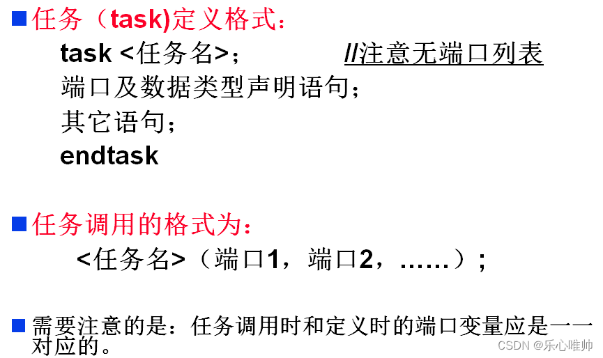- 定义任务时,没有端口名列表,但需要紧接着进行输入输出端口和数据类型的说明。