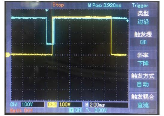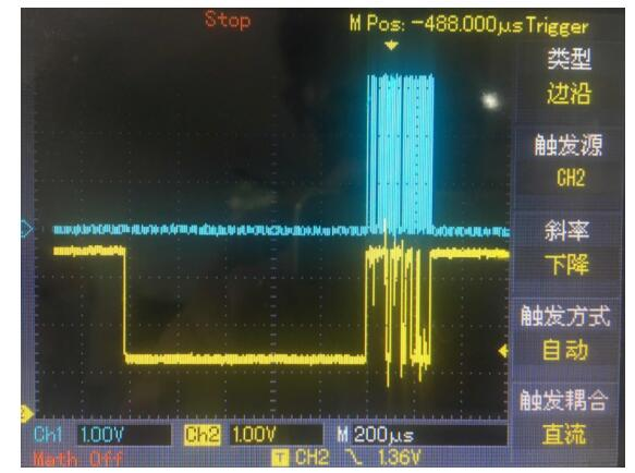 结果:上图中蓝线为HX711的SCK,黄线为DOUT数据。程序在DOUT数据准备好1MS时候开始采集数据。