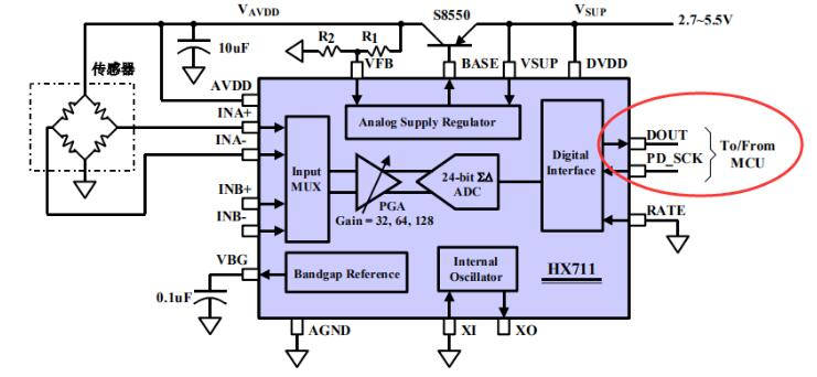 关于HX711的电路设计,这个不是重点,官方的数据手册上有推荐的设计电路。