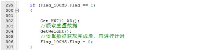 然后使用定时器,在定时器中断里面定义了一个100MS的标志Flag_100MS。然后在主函数中读取HX711数据,并计算体重。