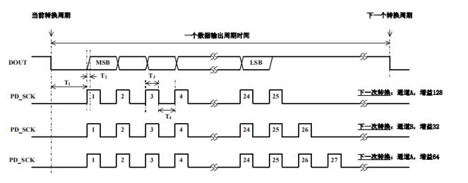 然后检测DOUT引脚的电平,当DOUT为低的时候(芯片ADC已经将数据转换OK),PD_SCK开始发送脉冲,DOUT需要在发送脉冲的下降沿读取数据。