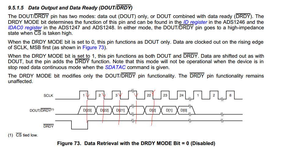 DRDY:数据准备引脚,平时为高电平,在转换开启前为高电平,转换开始后可以查询该引脚,如果AD转换结束该引脚会输出低电平,此时读取AD数据该引脚回复高电平。时序可以参考上图