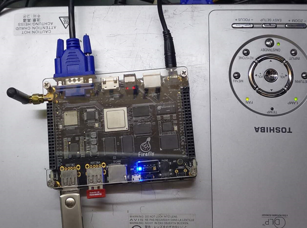 说完马上动手,首先翻出“铁盒版”的3288,满心欢喜接上VGA到投影,发现VGA根本没图像,但是开发板带的HDMI是可以的,逐进入系统找设置,发现设置里面根本没有VGA想过的选项。放弃。