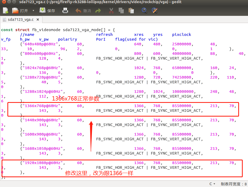 时间又过去了两天,周末刚好有点点时间,忽然灵机一动,为什么我不直接修改驱动呢?让设备读不出EDID后,直接用1366x768分辨率。(其实在Firefly论坛有人曾讲过他修改过VGA驱动,但是该网友不细讲,只简单提到)。虽然没人给指引,但是至少有人提到修改VGA驱动,那我也可以自己试试。