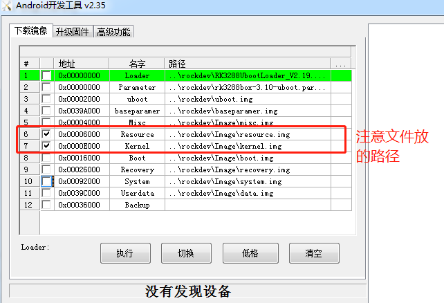 把生成的2个img文件用AndroidTool.exe烧录到开发板上。从虚拟机转移出这2个文件到烧录工具的rockdev文件夹里面,先把开发板连接5V电源,USB连接到电脑,然后按住recover按键不放手、再按reset键3秒,放开reset,稍等再放开recover键,电脑会识别出LOADER设备,然后勾选kernel和resource下载。(考虑到官方有足够的视频和资料,这里也没太大必要细讲)。