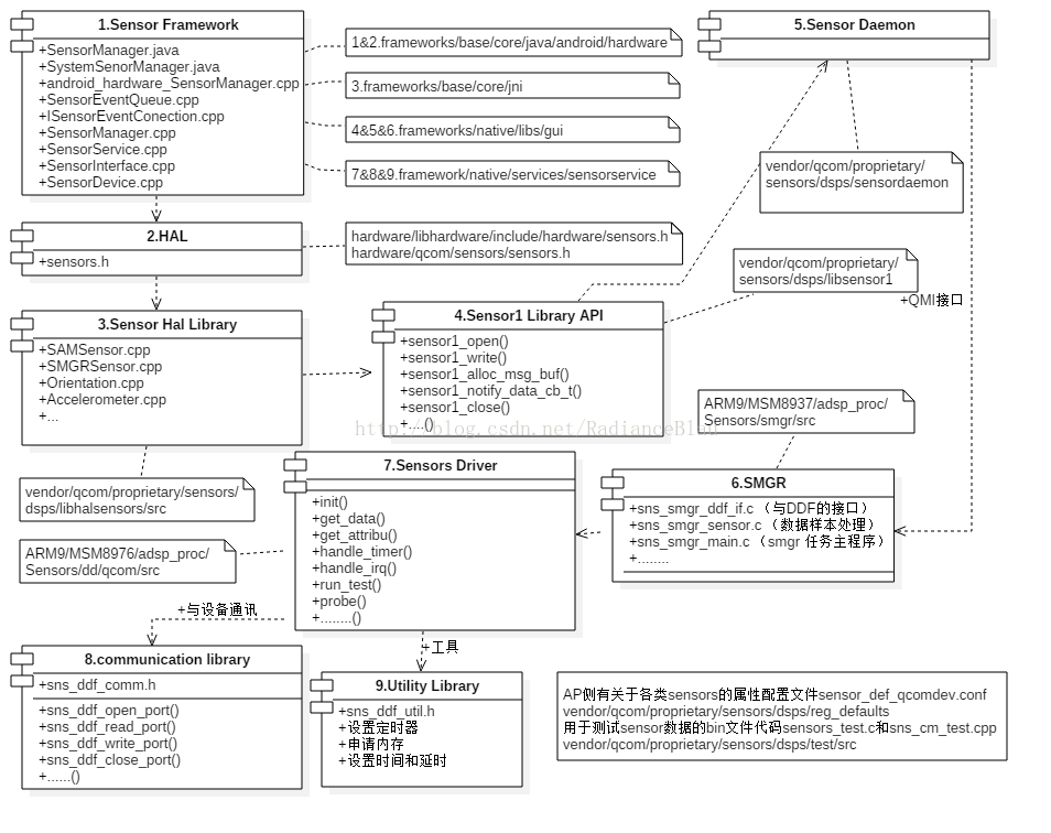 结合上一篇的测试代码,可以清楚的看到高通sensor的数据处理流程。图中7位置指示了每个基于ADSP架构的传感器需要实现的接口如下: