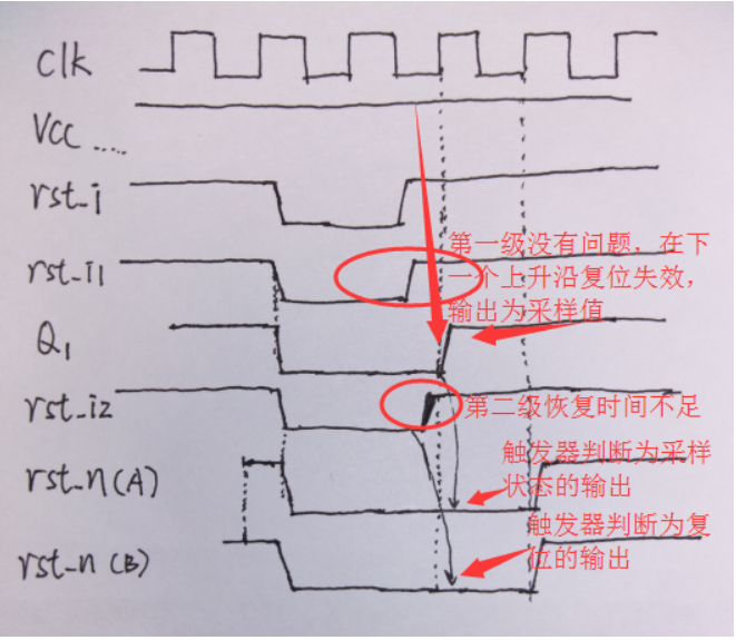 最极端的一种情况是,两级的撤离都不满足复位恢复时间或者去除时间,这时候的时序图如下所示: