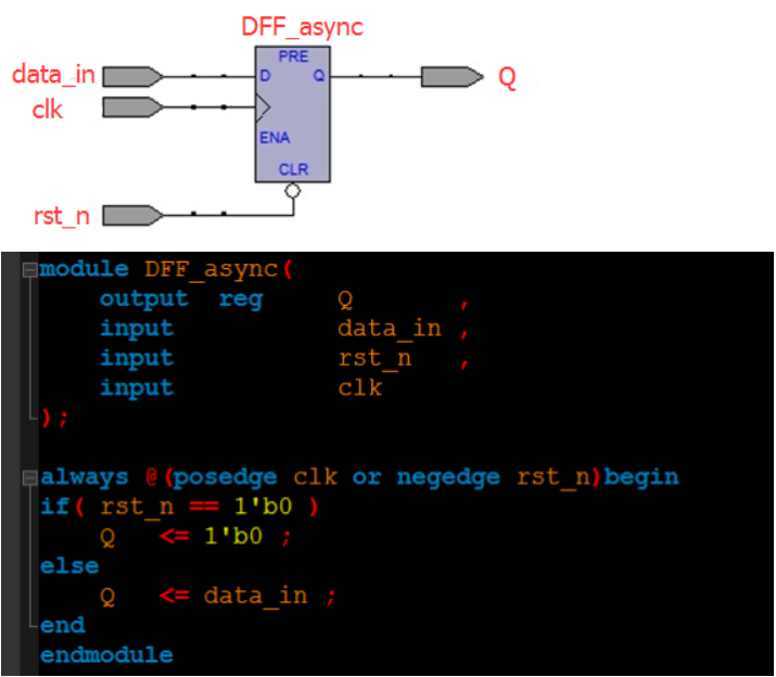 异步复位触发器则是在设计触发器的时候加入了一个复位引脚,也就是说复位逻辑集成在触发器里面。(一般情况下)低电平的复位信号到达触发器的复位端时,触发器进入复位状态,直到复位信号撤离。带异步复位的触发器电路图和RTL代码如下所示: