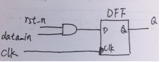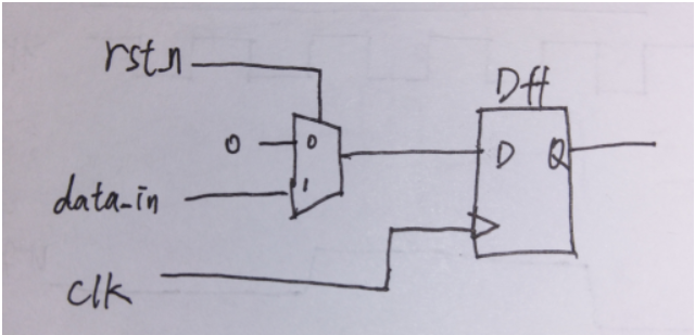同步复位是指复位信号在时钟有效沿到来时才复位电路(主要是复位触发器)。因此同步复位的复位信号受到时钟信号的控制。同步复位的触发器RTL代码和电路如下所示: