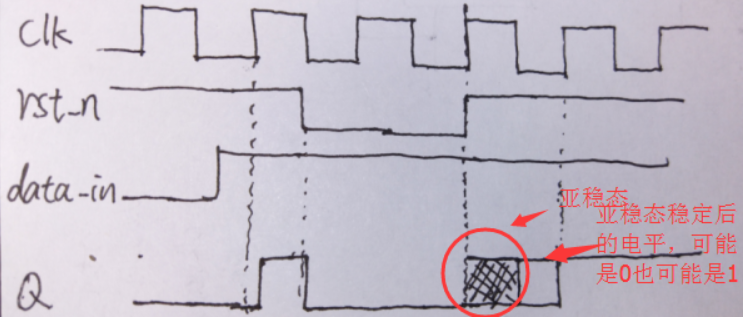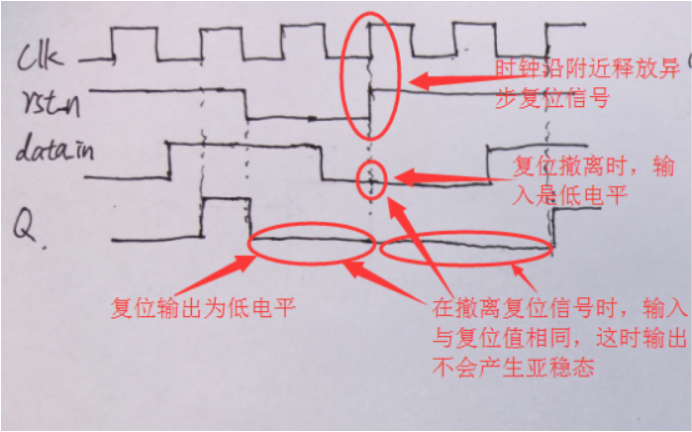 这是因为:复位信号翻转的时候,如果复位信号判断是低电平,输出就复位即一定是低电平;如果判断复位信号是高电平,输出信号就等于对输入信号的采样值。图里面输入信号就是低电平,不管你是复位还是不复位,输出一直是低电平,没有亚稳态。