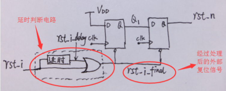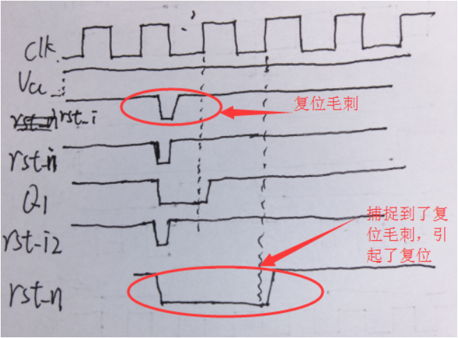 解决方法:一个是使用同步复位,另一个就是过滤毛刺了,过滤毛刺和消抖的思路有点像,主要就是经过一段延时之后,在经过逻辑门判断产生外部来的是不是真正复位信号,加上过滤毛刺信号部分的同步撤离电路和时序如下所示: