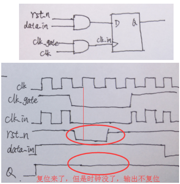 使用门控时钟的时候,由于复位信号依赖于时钟,在复位信号发出的时候,时钟可能关闭了,这个时候就会导致实际的电路没有被复位,如下图所示: