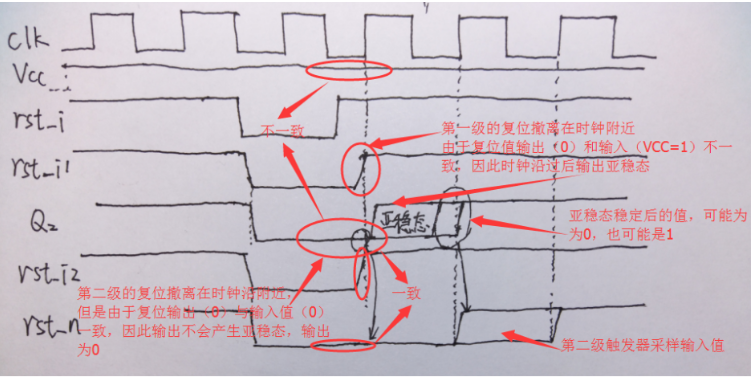 我们可以看到,第一级触发器虽然产生了亚稳态,但是由于第二级触发器的存在,亚稳态并没有传播下去,得到的复位信号依然是干净的,只不过这个复位信号可能延长多一个周期而已(这是因为亚稳态稳定后的可能态引起的)。