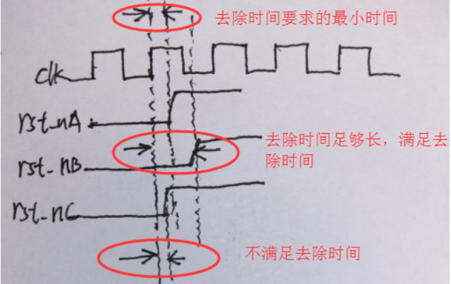 上图中,rst_nA是要求的复位去除时间,rst_n2满足复位去除时间,rst_n3复位去除时间不足。