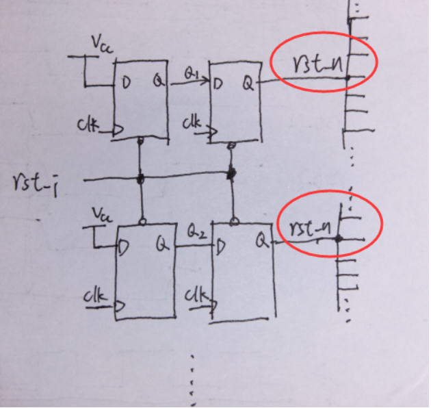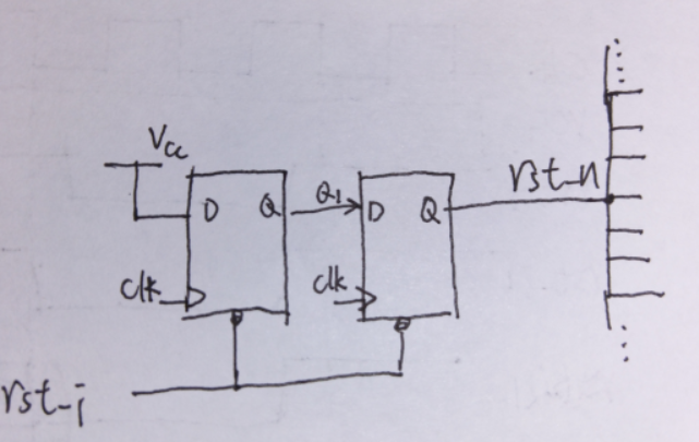 在数字电路里面,复位信号驱动了很多触发器,仅次于时钟,因此复位也往往形成或者使用复位网络。复位网络的设计也是有值得斟酌的地方,例如,由于复位的扇出太大,全部的复位不能仅仅由一个端口驱动,也就是不能像下面一样: