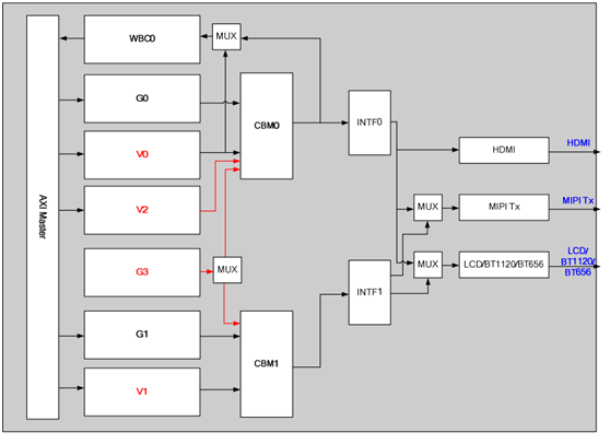 CBM(CrossBar and Mixer,选通叠加器):视频层 V0/视频层 V2/图形层 G0/鼠标层 G3 叠加 CBM0、视频层 V1/图形层 G1/鼠标层 G3 叠加 CBM1。