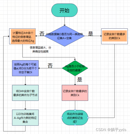 「输入」:训练数据集D,特征集A,阈值