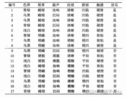 | 编号 | 色泽 | 根蒂 | 悄声 | 纹理 | 脐部 | 触感 | 是否好瓜 |