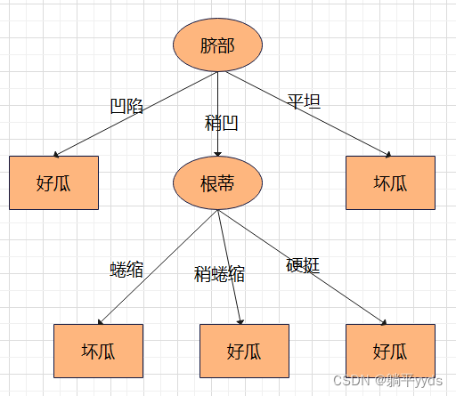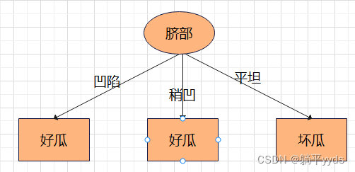 特征 条件熵 信息增益 色泽 0.724 0.276 根蒂 0.885 0.115 敲声 0.828 0.172 纹理 0.828 0.172 脐部 0.724 0.276 触感 1 0 生成的决策树:因为色泽和脐部的信息增益最大且一样,选择其中一个就可以。凹陷的瓜有3个为好瓜,1个为坏瓜,那么就认为凹陷对应好瓜啦;稍凹的瓜中,有2个是好瓜,2个是坏瓜,这里类标记不妨是好瓜;平坦的瓜中,2个都是坏瓜,得到类标记坏瓜。