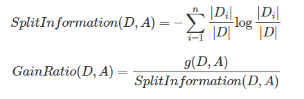(1)为了改进这个不足, C4.5中使用信息增益率(gain ratio) 作为分支标准,它通过引入一个被称作分裂信息(Split information)的项,惩罚取值较多的特征。
