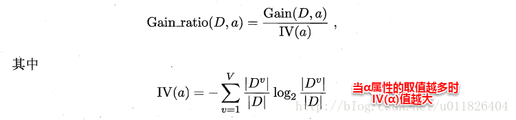 ID3算法存在一个问题,就是偏向于取值数目较多的属性,例如:如果存在一个唯一标识,这样样本集D将会被划分为|D|个分支,每个分支只有一个样本,这样划分后的信息熵为零,十分纯净,但是对分类毫无用处。因此C4.5算法使用了“增益率”(gain ratio)来选择划分属性,来避免这个问题带来的困扰。首先使用ID3算法计算出信息增益高于平均水平的候选属性,接着C4.5计算这些候选属性的增益率,增益率定义为: