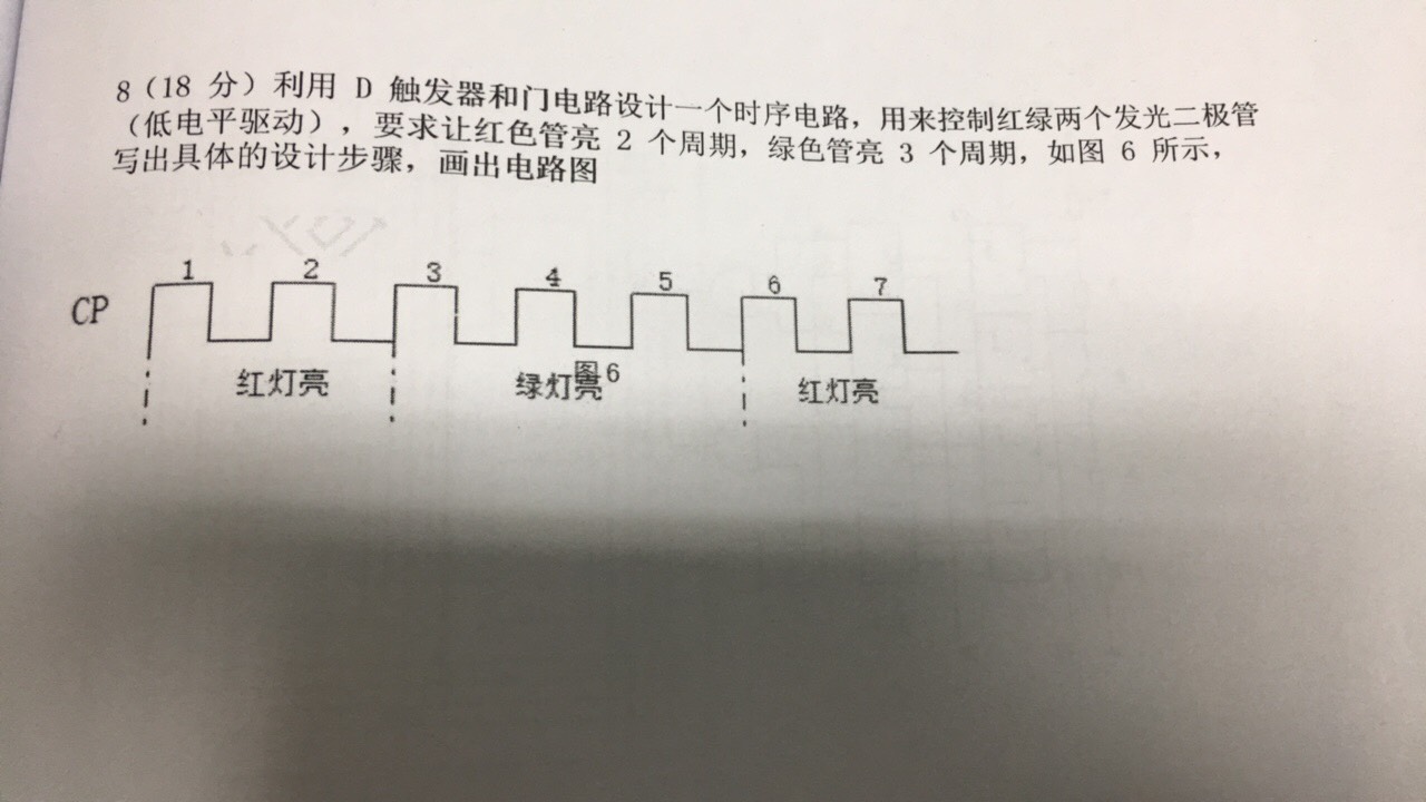 题目要求: 用D触发器和门电路设计一个时序逻辑电路, 用来控制红绿两个发光二极管(低电平驱动), 要求让红色管亮2个周期, 绿色管亮3个周期, 如图示(本文底部), 写出具体的设计步骤, 并绘制逻辑图.