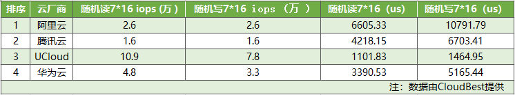 由队列深度分别为 1*1 和 7*16 的两组数据图表,我们可以看出,UCloud 在磁盘的随机读写测试中,表现都非常好,数据远超其他 3 家云厂商。