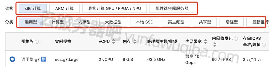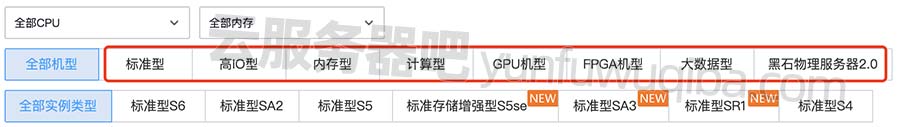 无论是阿里云还是腾讯云,企业级高性能云服务器都不差,均提供多种实例规格可选。像阿里云可选云服务器ECS计算型、通用型、GPU型、大数据型、裸金属都等实例,在阿里云服务器ECS页面即可查询,如下图: