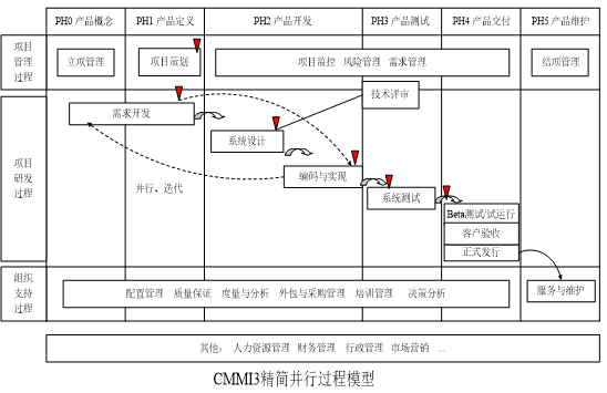 为实现以上项目质量管理策略和监制策略,参考CMMI3过程模型。该模型包括管理过程域、研发过程域、组织支持过程域。其中管理过程域包括:立项管理、结项管理、项目计划、项目监控、风险管理、需求变更管理等过程;研发过程域包括:需求开发、系统设计(架构设计、软件设计)、编码与实现(编码、编制产品支持文档、单元测试、软件集成、集成测试)、系统测试、试运行、验收测试、软件发行等过程;组织支持过程包括:配置管理、产品与过程质量保证、度量分析、培训管理、决策分析、服务与维护等过程。其过程模型如下图所示: