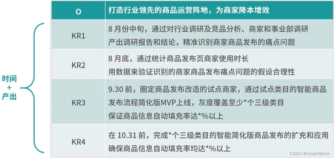 所以,在研发同学的 OKR 制定中,不仅仅要能有功能上线的说明,也要能回归用户和客户视角,结合我给你的万能公式,把解决的组织经营问题写明才行。该 OKR 制定的另外一个优点就是在 KR 3 中的具体实践方法采用了新的 pwi 前端技术挑战型 KR 置顶,就是要回到行业上来看,把行业中的新技术新方法能够涌到组织当中,这样才能为组织创造突破的业绩效果。当然 KR 3 的不足点就是我们把具体解决的用户问题说清,同时和 KR 21 样,缺乏了通过什么量化的数值结果来度量用户体验的提升。 KR 2 和 KR 3 量化了用户体验,结果可以仿照 KR 1 的满意度提升来进行设计和改善。那么当我们看完了研发类的 OKR 之后,我们再来看一个探索型项目的 OKR 案例。该案例是京东某商品管理项目的 OKR 该项目的 OKR 的 O 写的是打造行业领先的商品运营阵地,为商家降本增效支撑。这个 O 的 KR 1 就是 8 月中旬通过对行业调研及竞品分析、商家和事业部调研,产出调研报告和结论,精准识别商家商品发布的痛点问题。 KR 2 就是 8 月底通过统计商品发布物业商家使用市场用数据来验证识别商家商品发布痛点问题的假设合理群 KR 3,9月 30 号前圈定商品发布改造的试点商家,通过试点类目的智能商品发布流程简化版还无批上新灰度覆盖至少多少个三级类目,保证商品信息自动提供率达百分之多少以上? KR 4 在 10 月 31 号前完成多少个三级类目的智能简化版商品发布的破旧的应用,确保商品信息自动填充率达分身着招以上。