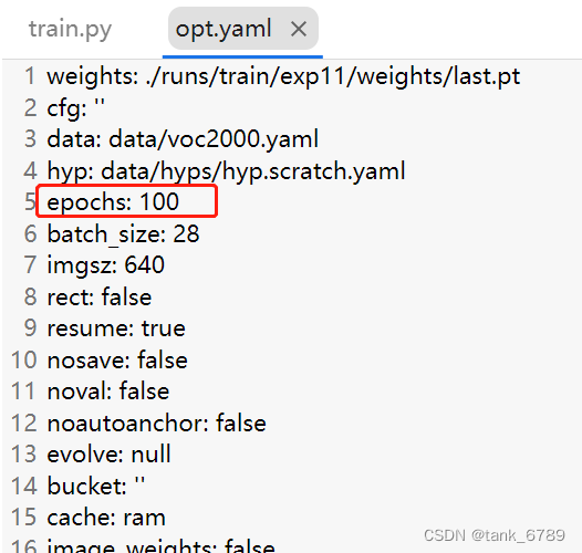 3、修改runs→train→exp11中opt.yaml中epoch数目为你想要的数字。