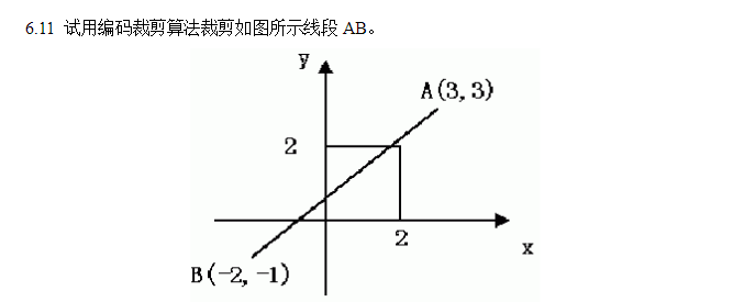 1.首先对AB进行编码,(窗口内的编码为0000,这四位从右往左依次是左右下上。)A的编码code1为1010,B的编码为 0101.由于code1|code2不等于0(如果等于0说明全都是0,那么就简取),且code1&code2=0(如果不等于0,说明有1,线段两个端点都在窗口外的同一侧,那么就简弃)所以既不能简取也不能简弃。