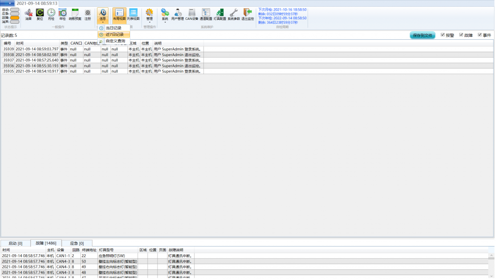 可查看历史操作、故障、事件信息、可按日期进行查询。