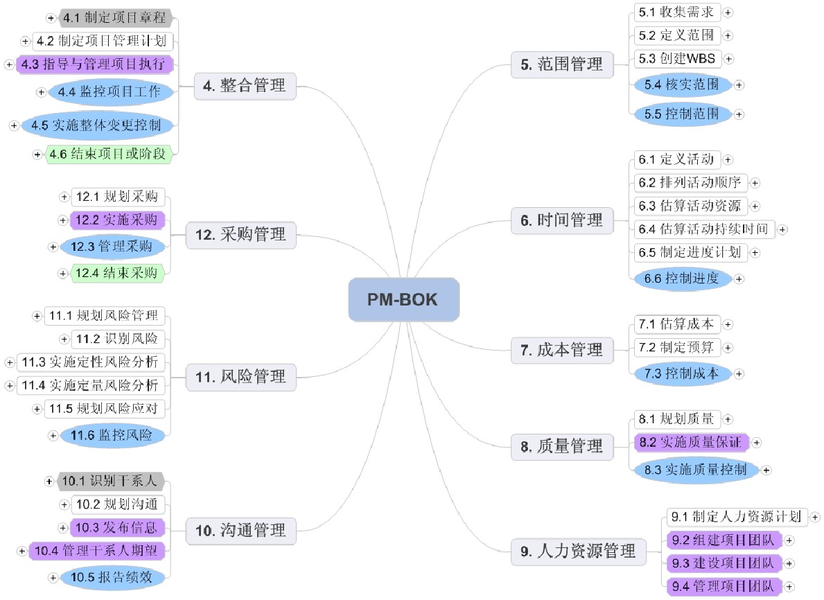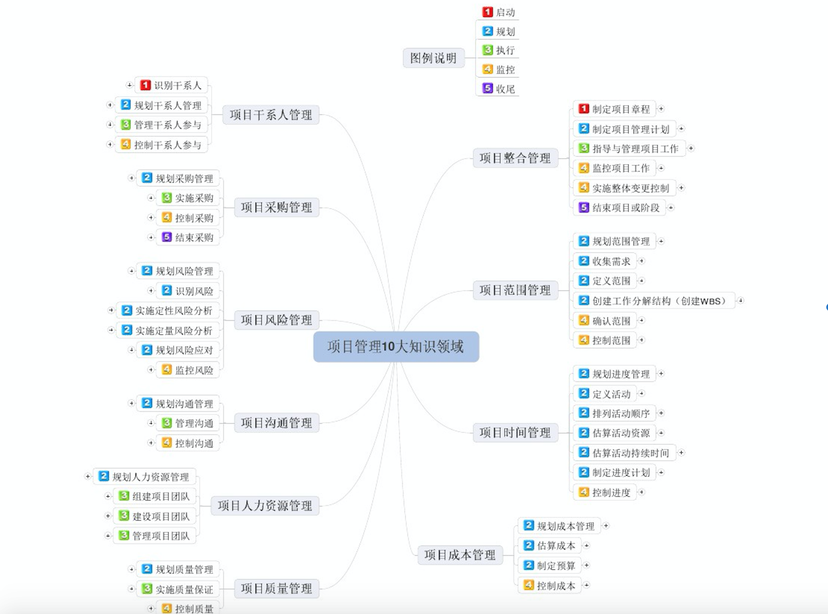 下图为思维导图化制的项目管理要素:灰色为启动过程组、白色为规划过程组、紫色为执行过程组、蓝色为监控过程组、绿色为收尾过程组。