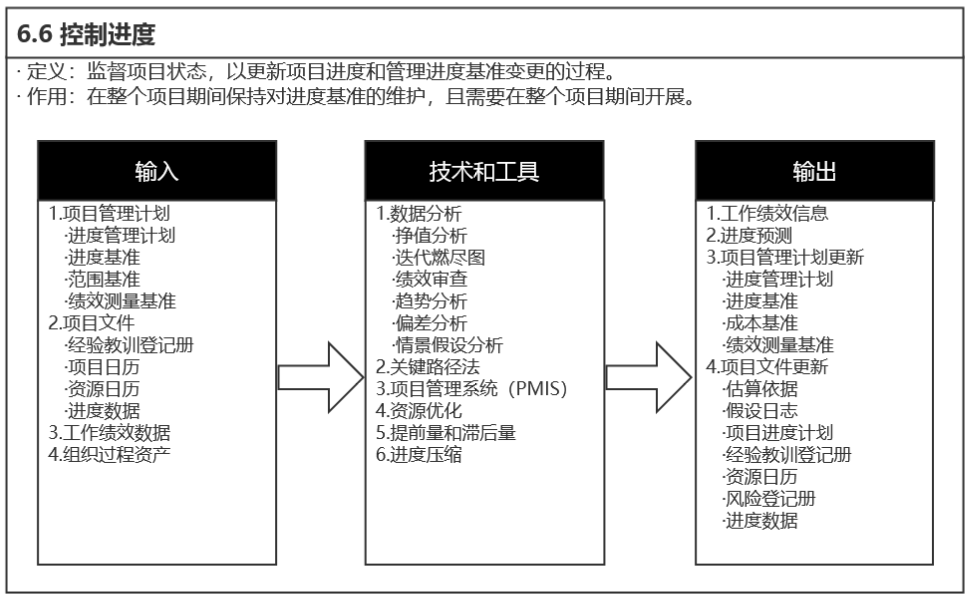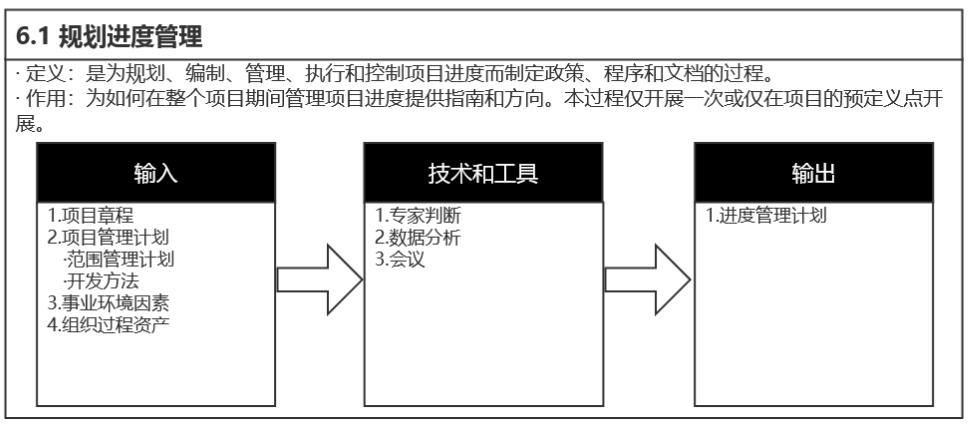 进度管理计划是项目管理计划的组成部分,为编制、监督和控制项目进度建立准则和明确活动。