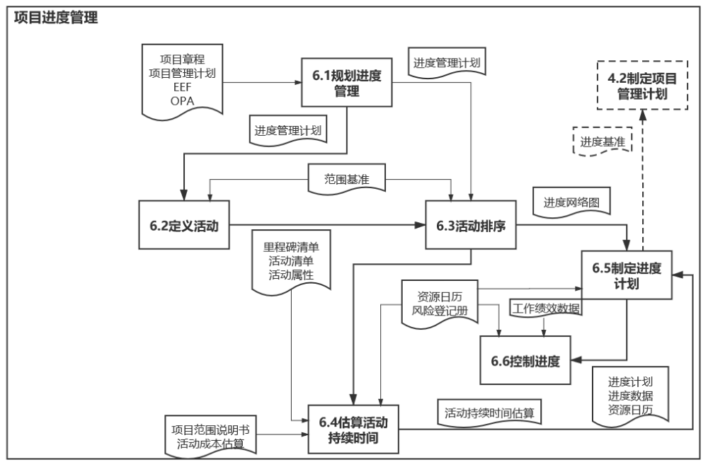 进度管理的全过程可以理解为,为了达成管理进度的目标,在进度管理计划的要求下,在工作分解结构(WBS)的基础上,根据各个工作包的需要,统计完成项目所必须进行的活动,分析活动之间的逻辑关系,估算工期和资源,制定进度计划并对已批准的进度基准进行监控的过程。